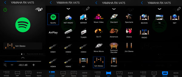 Además todos los modelos, exceptuando el RX-V379 que es el más básico, disponen de aplicaciones incluidas en el propio receptor para disfrutar de la música On-line, como es Spotify, música mediante DLNA, AirPlay y radio por internet. Te añado imágenes de algunas de las funciones de App para móviles: